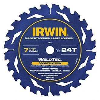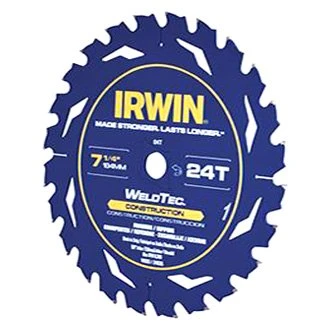 WeldTec™ 7-1/4″ 24T Carbide ATB Circular Saw Blade (24035) by IRWIN®. The IRWIN WeldTec™ Circular Saw Blades are precision engineered to deliver long life and durability without sacrificing speed of cut. Made in Italy, these blades feature exclusive welded carbide teeth for industry-leading strength. The heat resistant non-stick coating reduces binding and gumming so the blades run cooler and and deliver cleaner, truer cuts. Plus, the blades are laser cut with expansion control slots to reduce warping and vibration. The new blades are available for Construction, Demolition and Specialty applications.