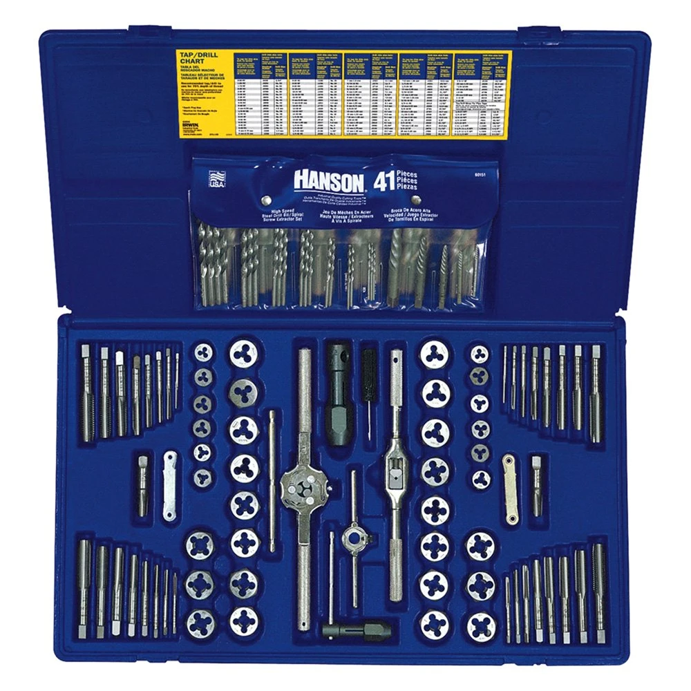 Hanson™ 117-Piece SAE HCS Right-Hand Deluxe Tap/Die/Drill Bit Set by IRWIN®. Hanson working with a variety of tradesmen to solve endless fastening challenges: Hanson® Taps & Dies are the answer. Whether creating new tools from raw steel or repairing damaged and worn threads, achieving a precise fit is essential. Hanson® sets the standard for delivering quality every step of the way in your threading applications.