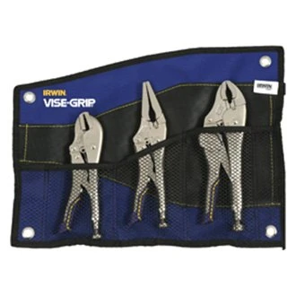 Vise Grip™ Fast Release™ 3-piece 7″ to 10″ Metal Handle V/Long Nose/Straight/Curved Jaws Locking Pliers Set by IRWIN®. The IRWIN VISE-GRIP fast release locking pliers set are built with Heat treated alloy steel for maximum durability. Features an easy to open, no-trigger release ansd hardened teeth Designed to grip from any angle. All tools in the kit feature a redesigned tactile grip for improved control.